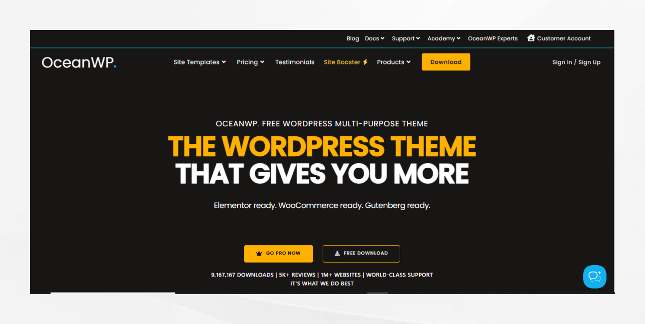 OceanWP is one of the most versatile free WordPress themes still widely used by businesses in 2026. It offers a strong balance between flexibility, performance, and e-commerce readiness, making it a popular choice for companies that want more control without committing to a premium theme upfront.